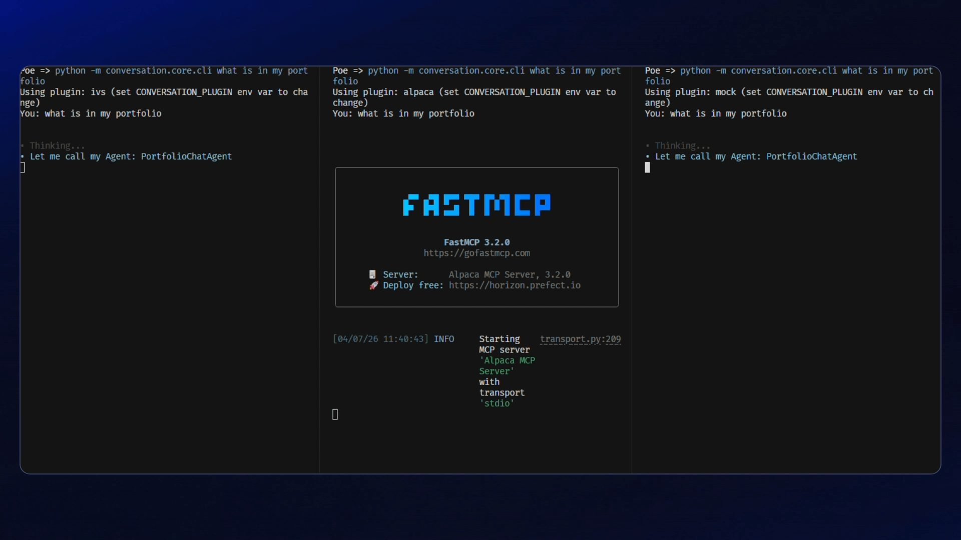 That split is important because large banks and brokers rarely have identical infrastructure. One may expose a clean portfolio API. Another may split holdings, cash, and transactions across services. Another may prefer an MCP server. Another may require gRPC for operational services and HTTP/SSE for frontend updates.