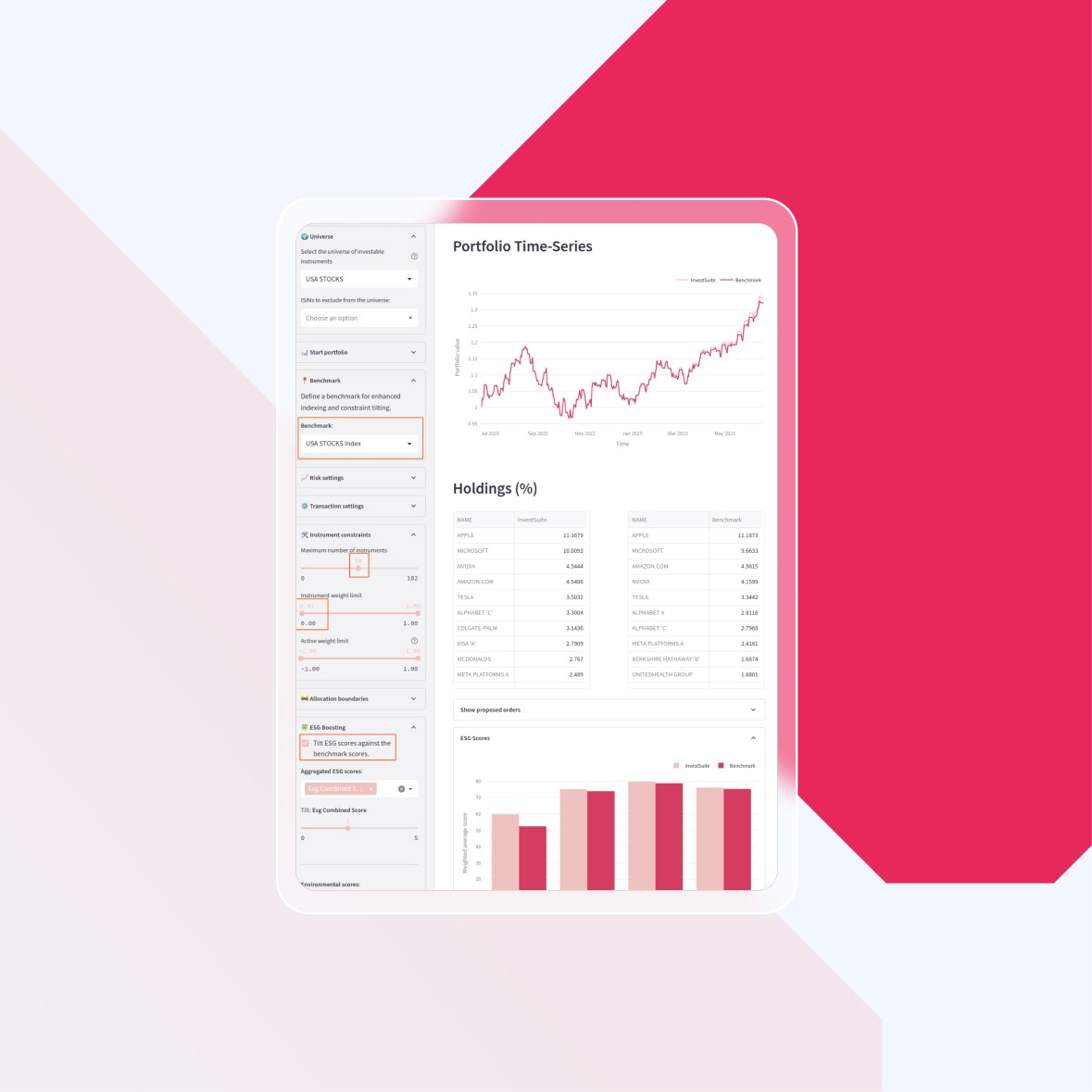 Integrating our portfolio construction APIs or console is fast. You can start optimizing, tracking indices, protecting floors, or tilting portfolios towards tangible factors or ESG metrics quickly.